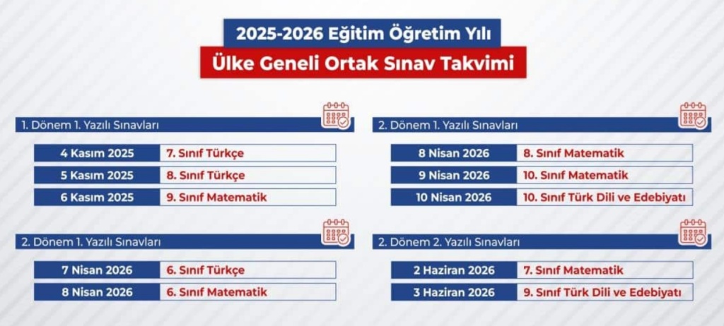 Yayımlanan takvime göre 1. dönem 1. yazılı sınavları Kasım 2025'te; 7. sınıf Türkçe dersi için 4 Kasım Salı, 8. sınıf Türkçe dersi için 5 Kasım Çarşamba, 9. sınıf matematik dersi için 6 Kasım Perşembe günü gerçekleştirilecek.
